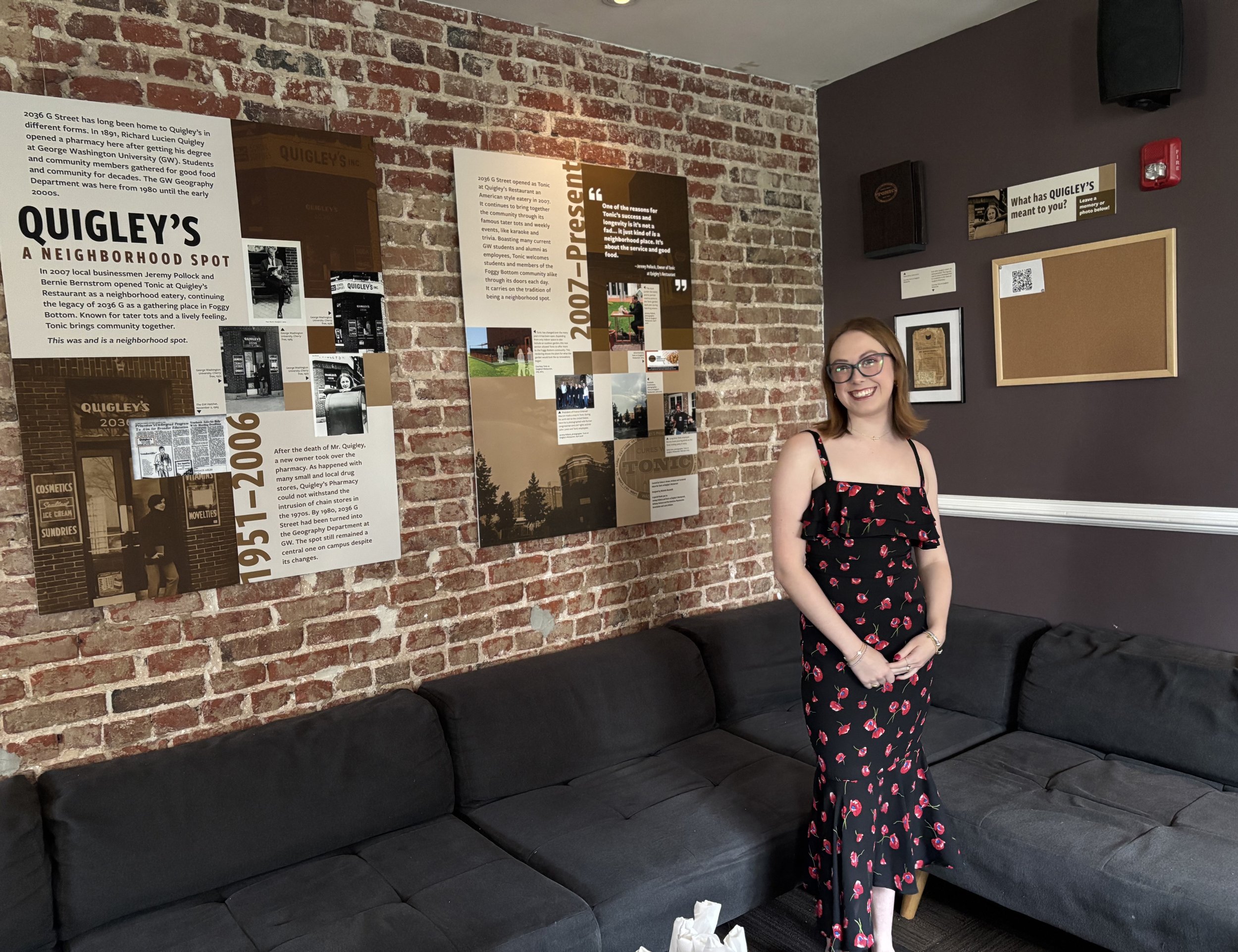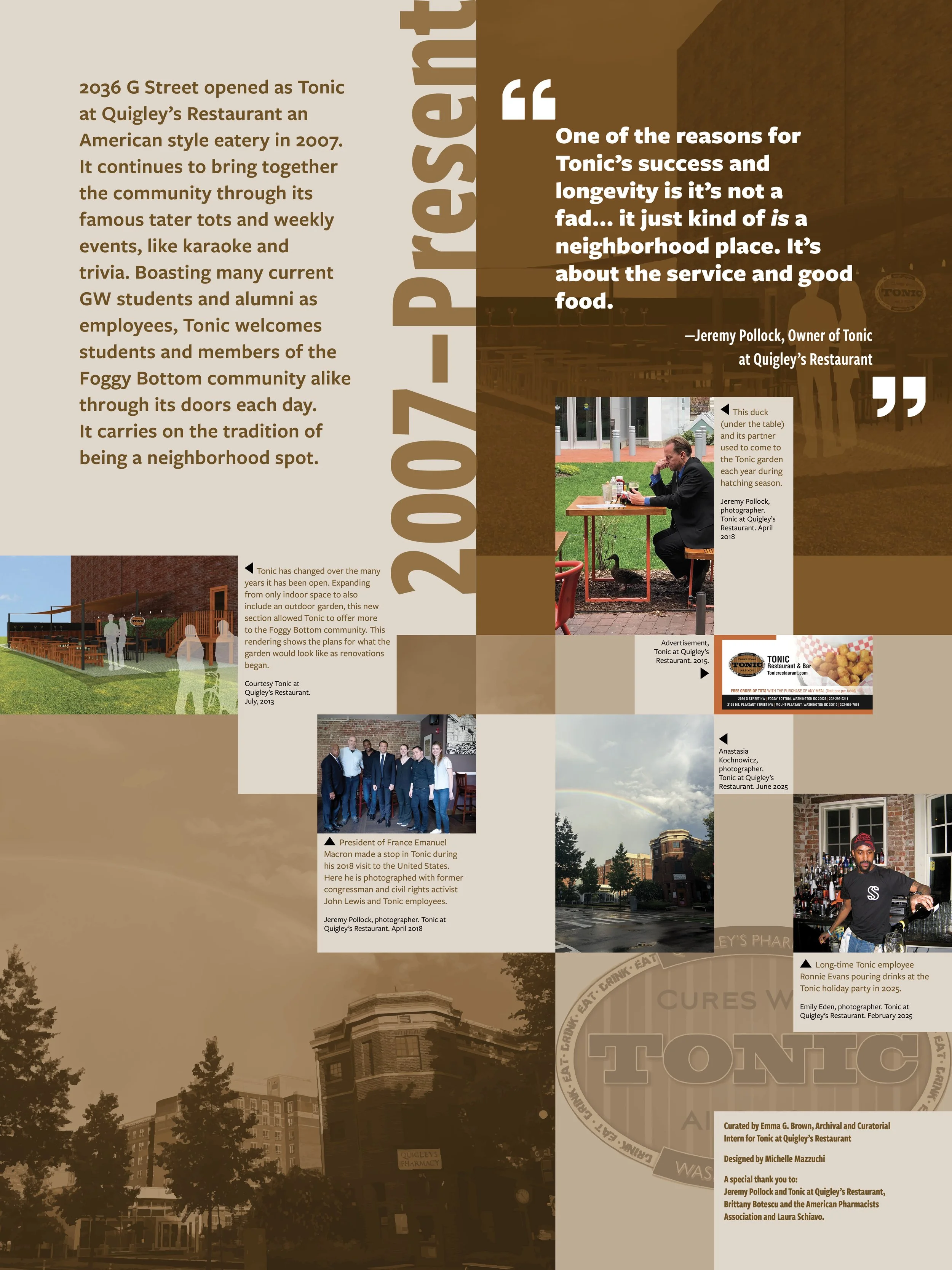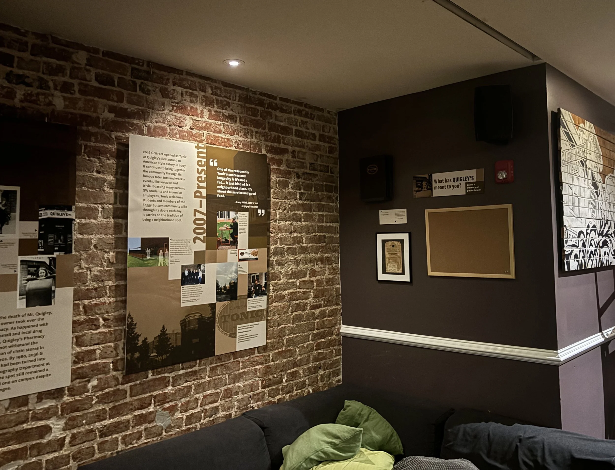 This design included text panels, labels, and the layout for Quigley's: A Neighborhood Spot at Tonic at Quigley’s Restaurant, curated by Emma G. Brown, an MA student in Museum Studies at the Corcoran School of the Arts & Design at GW, who served as Archival and Curatorial Intern for Tonic at Quigley’s Restaurant. I designed exhibition graphics based on Emma’s script — which included archival photos, as well as objects and an interactive element — showcasing the research she did on the history of the building and its connection to the GW community. The exhibition opened in September 2025 and continues on the third floor of the restaurant.